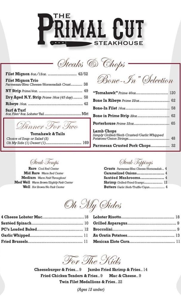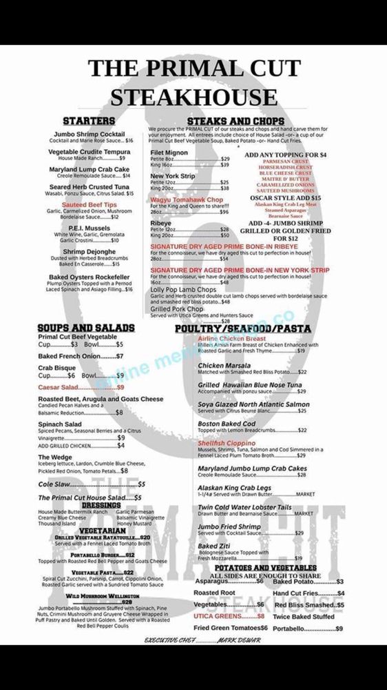 Introducing The Primal Cut Steakhouse, a gem in Tinley Park, IL that offers a fantastic dining experience. The menu boasts mouthwatering starters like Heirloom Tomato Bruschetta and Blackened Seared Sea Scallops. For soups, the Crab Bisque Soup is a must-try. The salads range from the classic Caesar to a unique Primal Cut Wedge with pork belly and bleu cheese. Customer reviews rave about the impeccable service and delicious dishes, such as the Rockefeller Oysters and Lobster Bisque. The lively atmosphere and top-notch cocktails make this steakhouse a favorite among locals. Make sure to stop by The Primal Cut Steakhouse for a memorable dining experience!